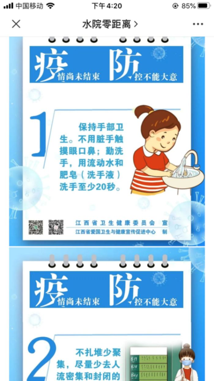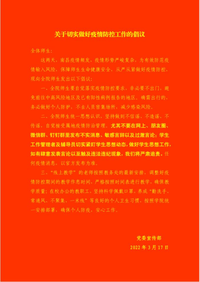 学院通过学院官网、官方微信公众号、水院零距离、钉钉工作群、昌通码等平台做好疫情防控宣传,凝聚师生齐心抗疫的强大合力,推动形成“疫情防控,人人有责”的浓厚氛围。同时,学院向各个支部、全体师生党员发出倡议,提高思想认识,勇于担当作为,坚决克服麻痹思想、侥幸心理、松劲心态,以积极防疫的姿态与勇气,充分发挥学院党支部的战斗堡垒作用和党员先锋模范作用。