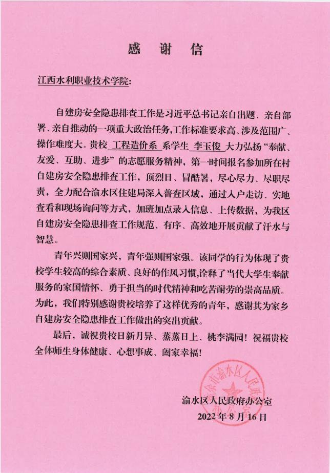 在党的二十大即将召开之前夕,我院建筑工程系工程造价专业学生李玉俊在暑假期间,充分发挥专业优势,积极参加所在村自建房安全隐患排查工作,以“做示范、勇争先”的青年担当献礼二十大,展现出我院学子“筑梦家园 强国有我”的家国情怀。以此,学院号召全院师生学习李玉俊学生这种“奉献、友爱、互助、进步”的志愿服务精神,并以实际行动履职尽责,担当作为。